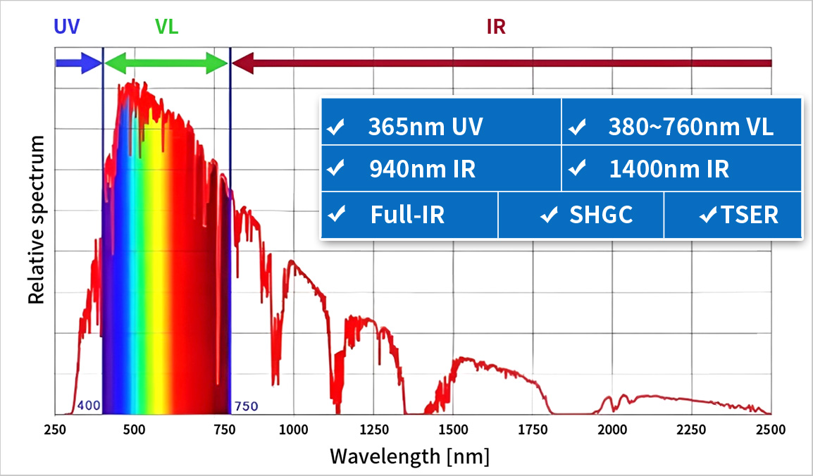 Прибор способен измерять семь оптических параметров, включая видимый свет, ультрафиолет, инфракрасное излучение 940 нм, инфракрасное излучение 1400 нм, полный инфракрасный диапазон, общий коэффициент отражения солнечной энергии (TSER) и общий коэффициент пропускания солнечной энергии (SHGC).