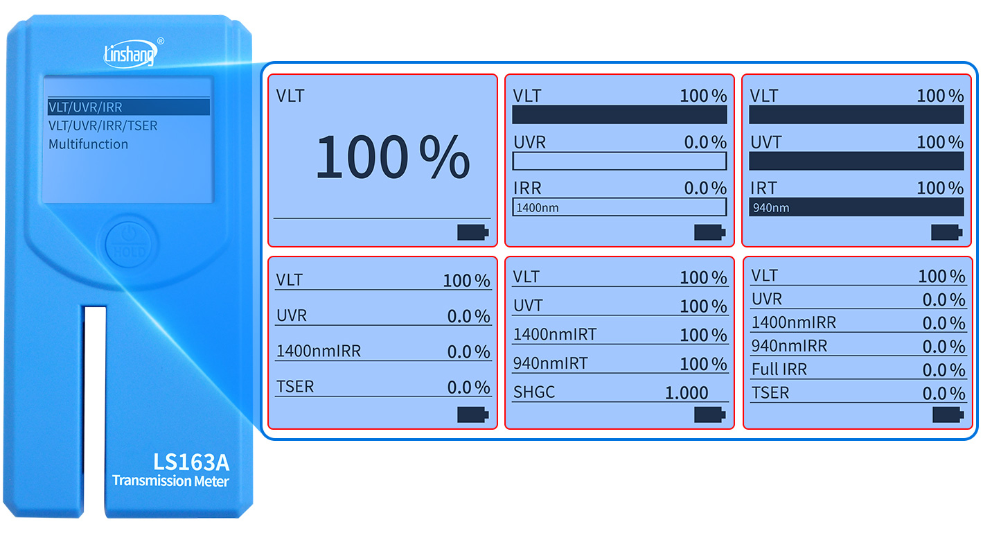 Прибор может измерять семь оптических параметров: видимый свет, ультрафиолет, инфракрасное излучение 940 нм, инфракрасное излучение 1400 нм, полный инфракрасный диапазон, общий коэффициент отражения солнечной энергии (TSER) и общий коэффициент пропускания солнечной энергии (SHGC). Пользователь может свободно комбинировать и отображать нужные параметры.