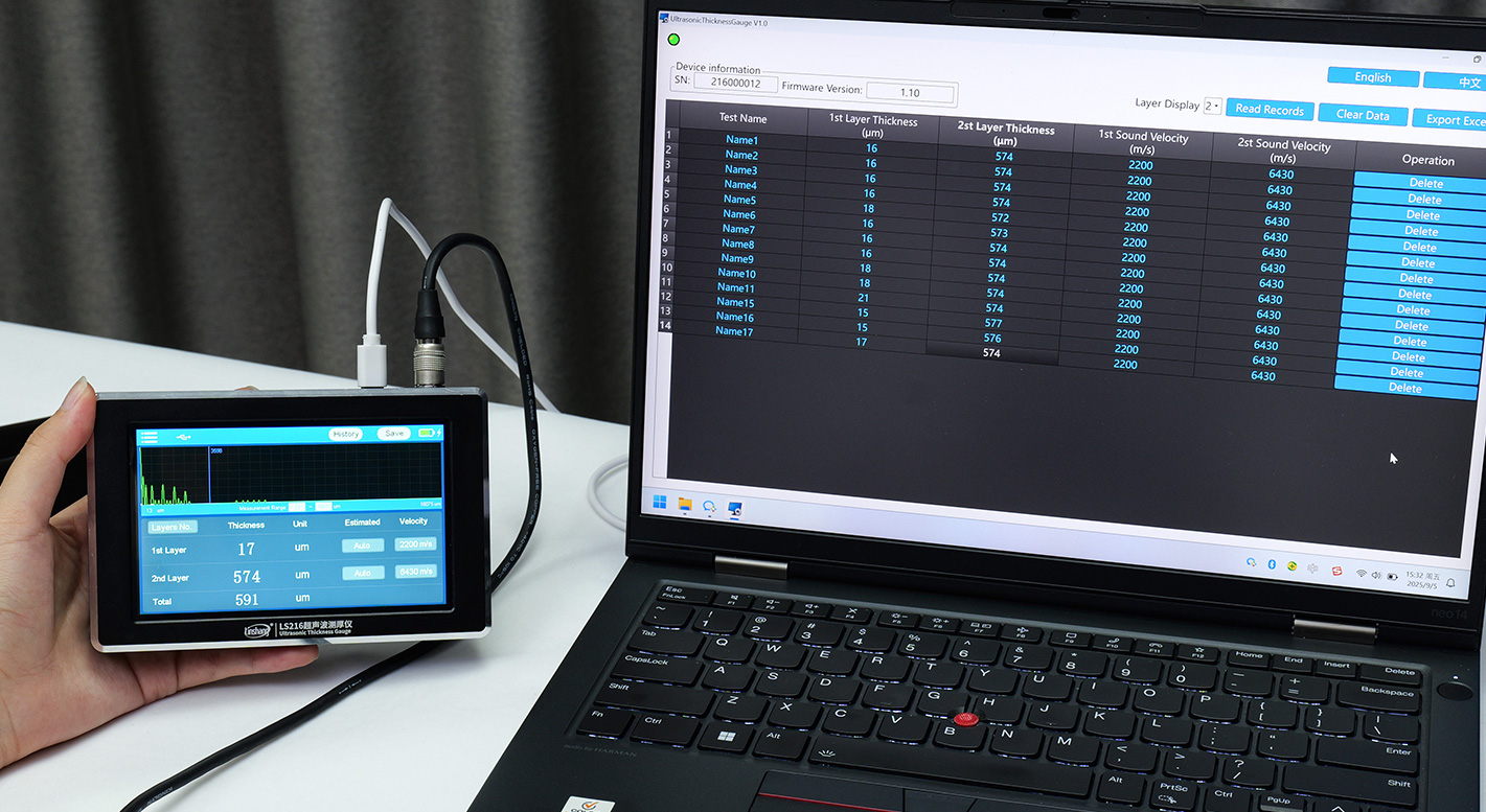 Поддерживается подключение к компьютерному программному обеспечению, данные измерений можно экспортировать одним кликом, что позволяет легко организовать их долгосрочное хранение и совместное использование в команде, делая управление данными о толщине материалов более интеллектуальным.