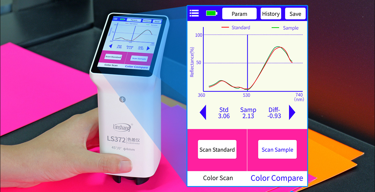 LS372 — это колориметр с интеллектуальным сенсорным экраном, специально разработанный для полиграфии, оснащён 3,5-дюймовым IPS цветным емкостным сенсорным экраном, обеспечивающим превосходный опыт использования. Измерительное отверстие прибора составляет 4 мм, используется стандартный источник света D50, соответствующий нормам цветового контроля в полиграфии, что позволяет достоверно воспроизводить цвет печатной продукции при стандартных условиях наблюдения и гарантировать, что результаты измерений имеют отраслевую значимость. В прибор встроено несколько цветовых карт, он способен быстро подбирать три наиболее близких к образцу номера цветовых карт, обладает функцией сравнения цветовых различий, поддерживает различные способы добавления стандартных цветов, позволяет задавать порог цветового различия, гибко выбирать формулы расчета ΔE, а также обеспечивает быстрый контроль качества (QC).
